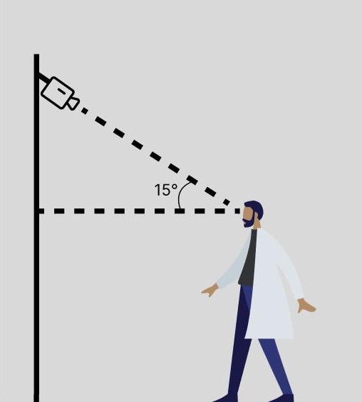 Угол вертикального наклона видеокамеры не должен превышать 15°. Вертикальный наклон — это отклонение оптической оси видеокамеры от горизонтальной плоскости, расположенной на уровне середины лица человека среднего роста (160 см).